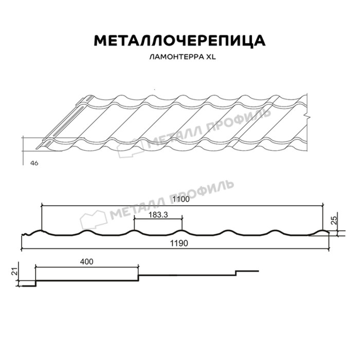 Если вам нужна традиционная металлочерепица для больших крыш, обратите внимание на Ламонтерра® XL. Она характеризуется увеличенными размерами: длина ступеней — 400 мм, высота — 21 мм. Большие плавные волны подчеркнут размеры скатов и сделают кровлю более эффектной.