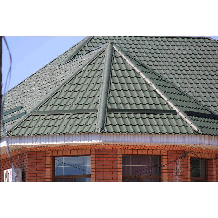 • Кровля защищена от механических воздействий, так как в основе металлочерепицы сталь толщиной 0.45 мм (с учётом металла, цинкового и полимерного слоя).
